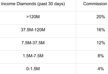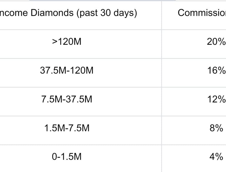 The agency commission rate is based on your host' and sub-agencies' total earnings in the past 30 days. The detailed rate sheet is as follows